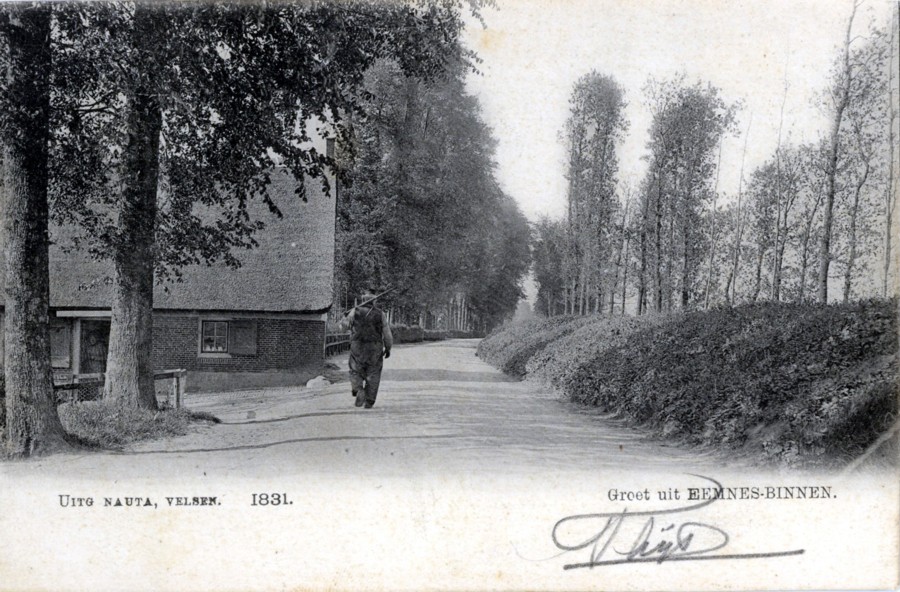 1. Deze boerderij, Wakkerendijk 278, die aan de grens van Baarn en Eemnes-Binnen lag, stond het verkeer op de smalle dijk danig in de weg. Moest in het verleden de voorgevel het al eens door het verkeer ontgelden, in later jaren moest de boerderij voor grondverslindende wegenaanleg helemaal wijken. In het verleden werd vóór deze boerderij de burgemeester bij officiële gelegenheden verwelkomd. Dit gebeurde bij zijn installatie of bij een feestelijke optocht, waarbij de koets van de burgervader zich in de stoet voegde om mee te rijden naar Buitendijk. Wie de man met de zeis en het vrouwtje in de deuropening zijn, was niet te achterhalen. |