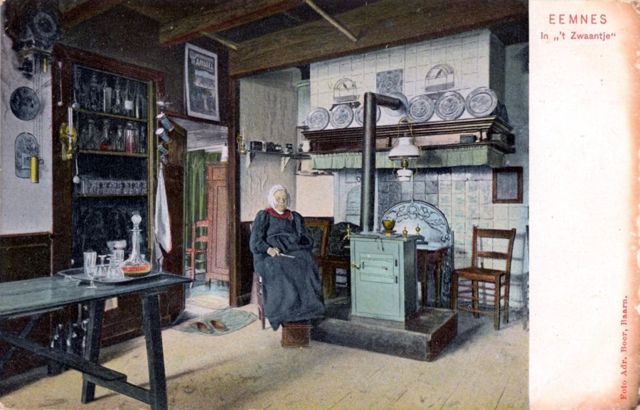 3. Café "Het Zwaantje", Wakkerendijk 258, was een van de oudste herbergen ter plaatse. Jacob van Lennep liet er Ferdinand Huyck in 1732 in de opkamer een maal gebruiken. Op deze foto zien we de vrouw van herbergier Driekus Luif, Annemeu Wortel (overleden 1909), bij de schouw zitten. Rechts ziet u de lei, waarop zij de verteringen noteerde. Het eeuwenoude huis werd, nadat het café verplaatst was, in 1925 door de familie Hoofd gekocht. Bij de restauratie in 1948 werden diverse oude munten en pijpenkoppen onder de vloer gevonden.