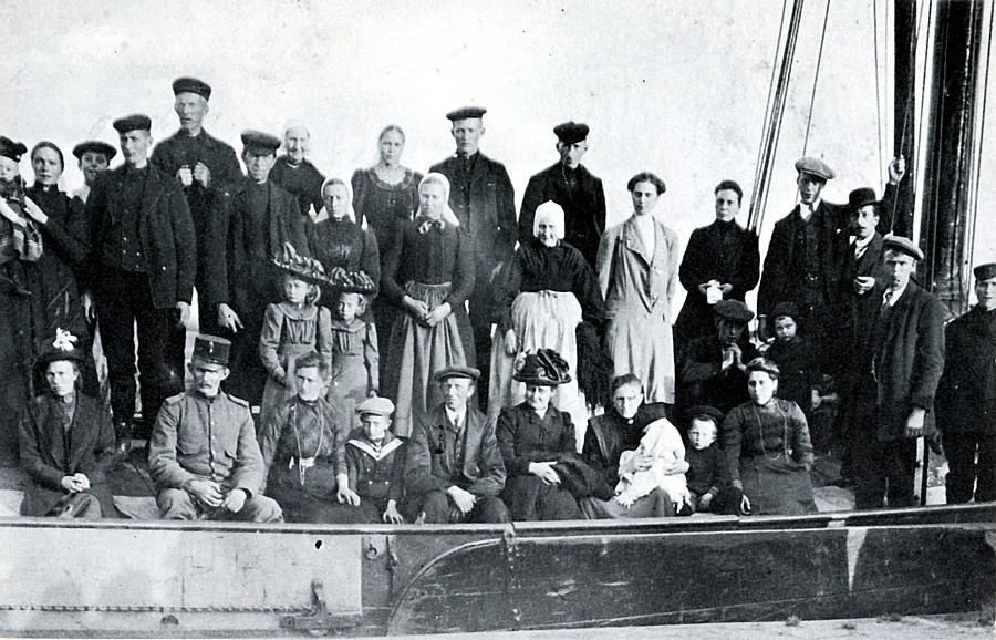 41. Gijs Scherpenzeel, "Gijs van de Sluus" omdat hij bij de sluis woonde, trouwde in 1915 in Leusden met Heintje Doornekamp, een weduwe die twee dochtertjes uit haar eerste huwelijk had. Hier staan bruidegom en bruid (achter de meisjes) met hun andere gasten op het motorschip van Gijs van IJken. Ze zijn op weg naar hun woonhuis bij de sluis. Tot 1923 bleven zij daar wonen, maar toen was moeder de angstige overstromingen zat en men verhuisde naar het dorp. Op de foto onder anderen Jan Scherpenzeel (derde van links) en (met bolhoed) Gijs Roothart.