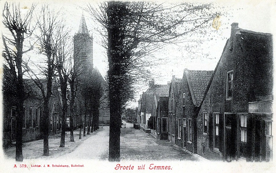 51. De Kerkstraat van rond 1915. Het huisje rechts (no. 2) was de bakkerij van Hilhorst. Daarnaast (no. 2A) woonde Ruizendaal, dan (no. 4) Everts de smid en Piet Majoor. Vervolgens (no. 6) Daatje Nagel (kruidenierswaren) en iets verder Teus Roodhart (kolenboer). Achteraan was de oude hervormde pastorie. Links zien we nog net het nu herbouwde "Hooge Huis" (no. 3 en 3A), volgens overlevering vroeger een klooster maar waarschijnlijker het woonhuis van "klopjes" en daarnaast (no. 5) het café van Jan Eek, de opvolger van Van Geer en dan volgde Woudenberg.