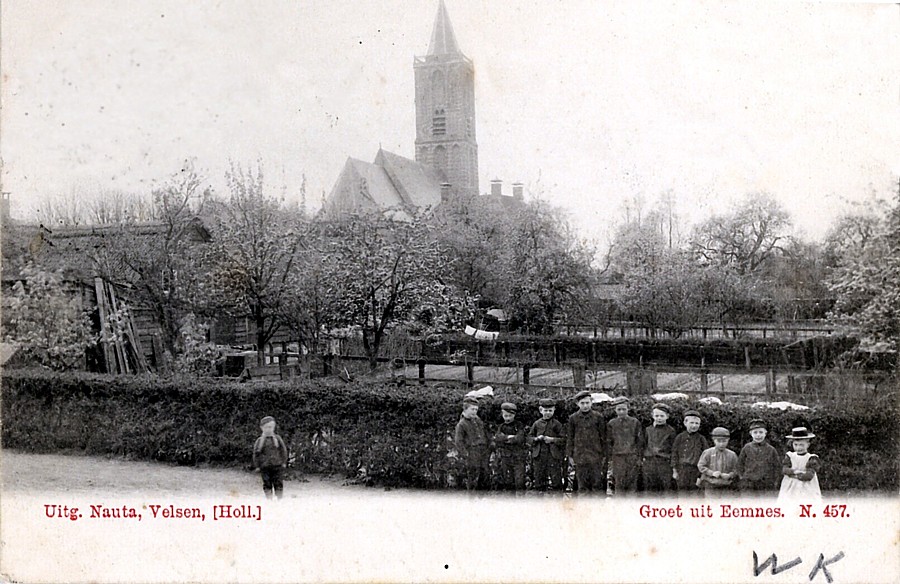 61. Op de hoek van de Wakkerendijk en de Laarderweg staat de dorpsjeugd te kijken naar de fotograaf die een mooi plaatje van de Nicolaaskerk wil schieten. Deze hervormde kerk, waarvan de stichtingsgeschiedenis teruggaat tot 1339, dateert uit de veertiende eeuw. Zowel de toren (uit 1521) als de kerk zijn vele malen gerestaureerd, waarbij dit steeds in jaartallen in de kerkmuur werd aangeduid. Een rondgang om de kerk verhaalt veel van haar historie. Een vroeger stovenhok en een nieuwe ingang vallen daarbij zeker op! Let ook op de wijzerplaat, een dakkapel en de diverse jaartallen bij de toreningang.